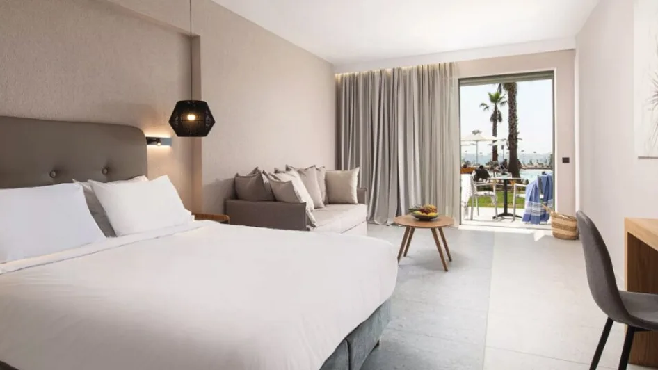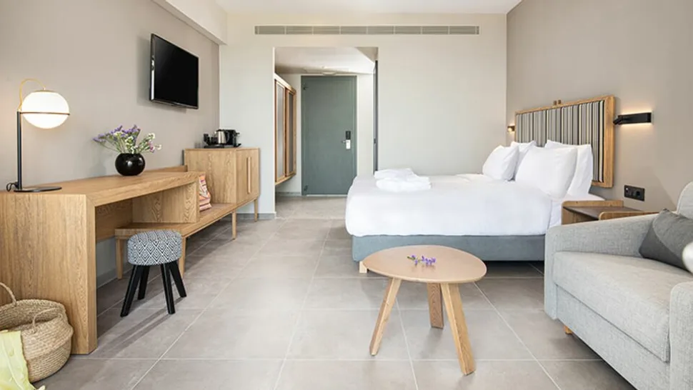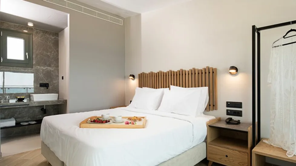 Hotel raspolaže sa oko 130 soba i apartmana, uređenih u modernom mediteranskom stilu, u toplim tonovima kamena i drveta. U ponudi su komforne dvokrevetne sobe, sobe sa izlazom na bazen, prostraniji apartmani sa dnevnim boravkom, kao i dvoetažni apartmani idealni za porodični odmor. Sve smeštajne jedinice imaju balkon ili terasu, klima-uređaj, moderno kupatilo, sef i sadržaje za pripremu toplih napitaka, a deo soba nudi prelep direktan ili bočni pogled na more i zalazak sunca.