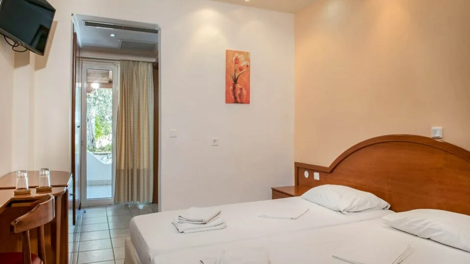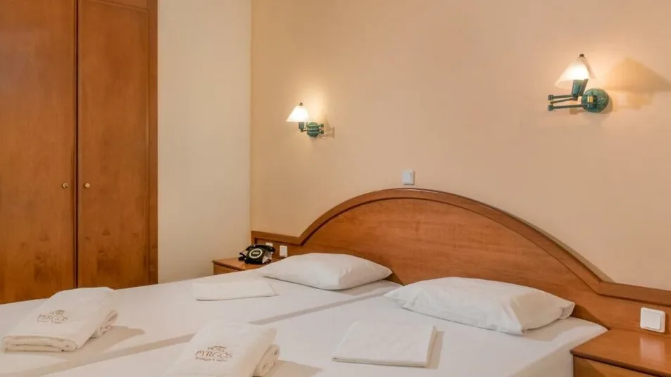 Smeštaj u hotelu čini manji broj udobnih i funkcionalno opremljenih soba, ukupno oko 28 soba, prilagođenih parovima, prijateljima ili manjim porodicama. Svaka soba poseduje kupatilo, klima-uređaj, frižider, televizor i balkon ili terasu, a deo smeštajnih jedinica nudi i lep pogled na more ili na zelenilo u zaleđu. U ponudi su standardne dvokrevetne i trokrevetne sobe, kao i porodične sobe sa pomoćnim ležajem ili krevetom na rasklapanje, što omogućava udoban boravak i za roditelje sa decom. ([bookaris.com](https://www.bookaris.com/hotel_pyrgos_220895_P1.html?utm_source=openai))