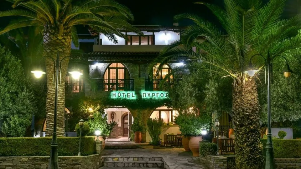 Hotel Pyrgos raspolaže spoljnim bazenom okruženim ležaljkama i suncobranima, idealnim za opuštanje tokom dana. Gostima su na raspolaganju ležaljke i suncobrani na obližnjoj plaži, kao i različiti sportovi na vodi u okolini. U prijatnoj sali za doručak svakog jutra se služi kontinentalni doručak, dok se u neposrednoj blizini nalaze brojni restorani sa tradicionalnom grčkom kuhinjom. U okviru objekta dostupni su recepcija, parking, bežični internet u zajedničkim prostorijama, bankomat u blizini, mogućnost iznajmljivanja automobila, kao i lekar na poziv, što dodatno doprinosi osećaju sigurnosti tokom odmora. ([hotel-pyrgos.gr](https://www.hotel-pyrgos.gr/?utm_source=openai))