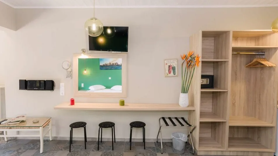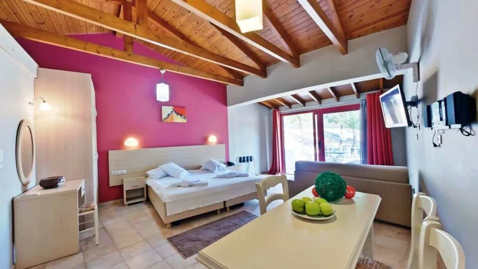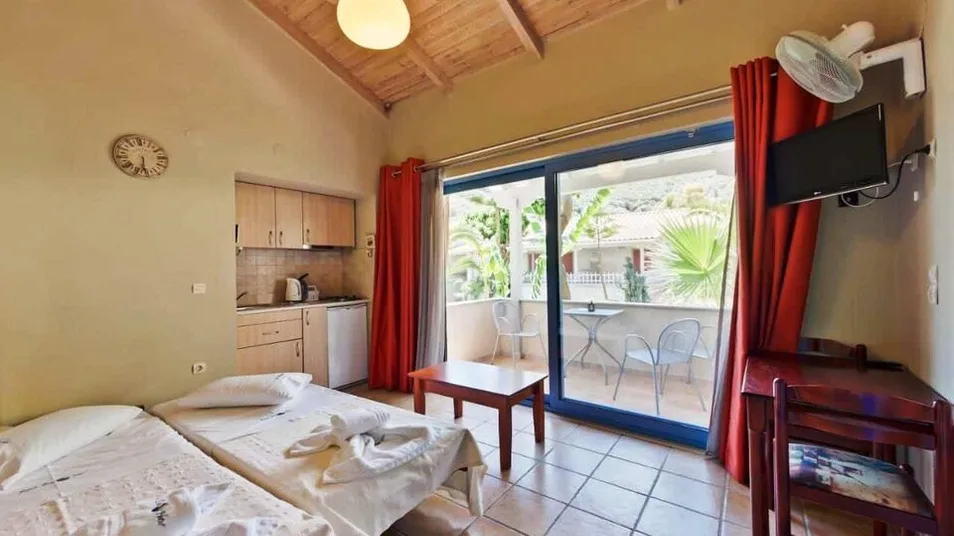 Hotel nudi studije, apartmane i veće apartmane, raspoređene u zgradama koje okružuju lepo uređen vrt. Smeštajne jedinice su prostrane, površine oko 30–55 m², i mogu da prime od 2 do 6 osoba, što ih čini pogodnim i za parove i za veće porodice. Mnoge jedinice imaju čajnu kuhinju sa trpezarijskim delom, sopstveno kupatilo sa fenom i kozmetikom, kao i balkon ili terasu sa pogledom na more ili baštu. Ukupno je na raspolaganju oko 38 soba i apartmana, klimatizovanih i opremljenih televizorom i bežičnim internetom.
