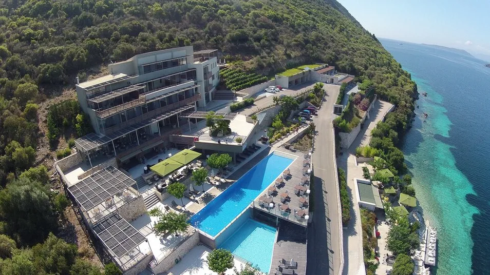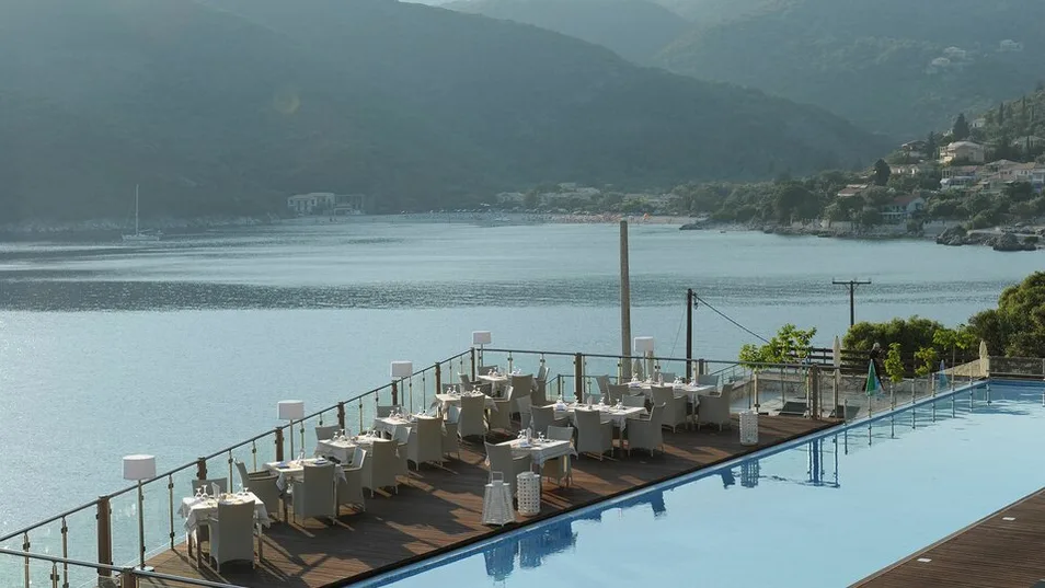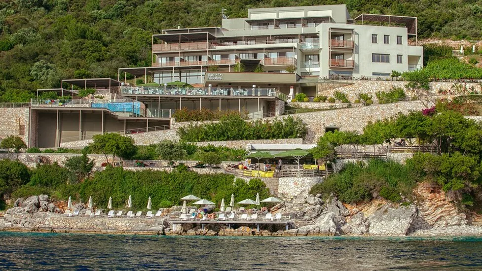 San Nicolas Resort je elegantan hotel sa 4 zvezdice, smešten na zelenom brdu iznad zaliva Mikros Gialos, na ostrvu Lefkada u Grčkoj. Okružen borovima i maslinjacima, nudi prelep panoramski pogled na tirkizno Jonsko more i mirnu uvalu sa šljunkovitom plažom. Do uređene plaže sa ležaljkama i suncobranima stiže se stepenicama za nekoliko minuta, dok je malo mesto Mikros Gialos sa tavernama i prodavnicama na kratkoj pešačkoj udaljenosti. Glavni grad Lefkade nalazi se na oko 26 km, a aerodrom Aktion kod Preveze je približno sat i po vožnje, što omogućava udoban transfer do hotela. ([sannicolas.gr](https://sannicolas.gr/?utm_source=openai))