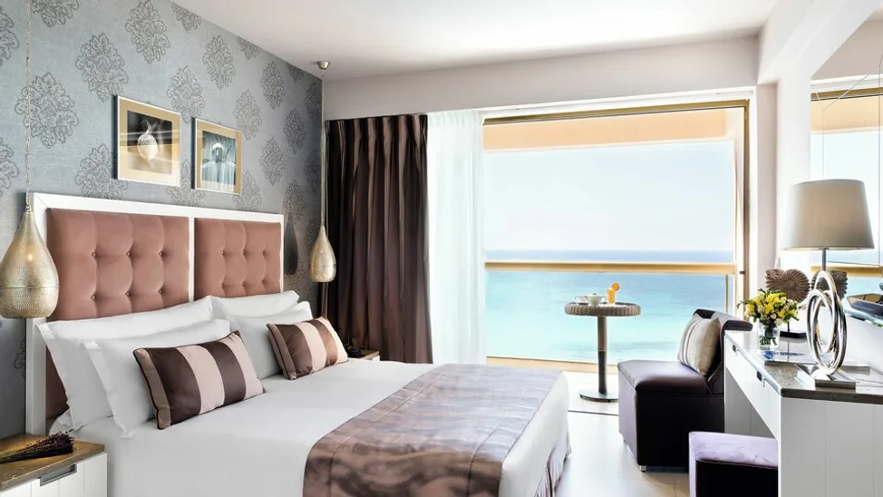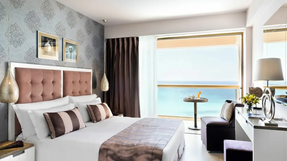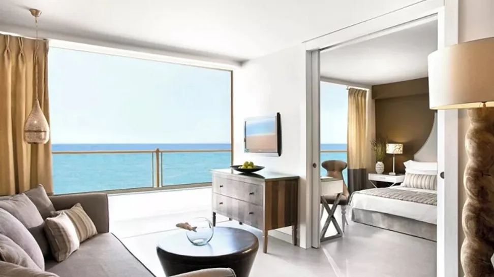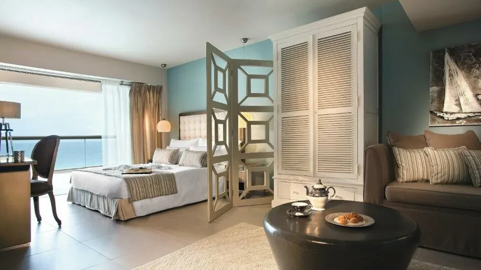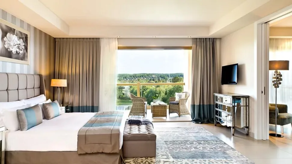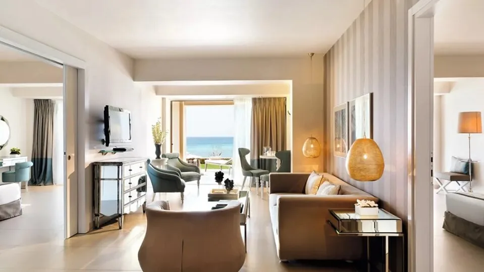Sani Beach raspolaže sa oko 392 soba i apartmana, raspoređenih u elegantnoj višespratnoj zgradi sa panoramskim pogledom na more ili zelene vrtove. Moderne dvokrevetne sobe sa balkonom pogodne su za parove, dok porodične sobe i prostraniji apartmani nude odvojene spavaće i dnevne zone, idealne za boravak sa decom. Sve jedinice su savremeno opremljene: klima-uređaj, televizor ravnog ekrana, mini-bar, sef, aparat za kafu, kupatilo sa kadom ili tušem, bade-mantili i papuče obezbeđuju visok nivo udobnosti. Velike terase sa garniturama za sedenje pozivaju na opuštanje uz zalazak sunca i pogled na Egejsko more. ([sani-resort.com](https://sani-resort.com/our-hotels/sani-beach?utm_source=openai))