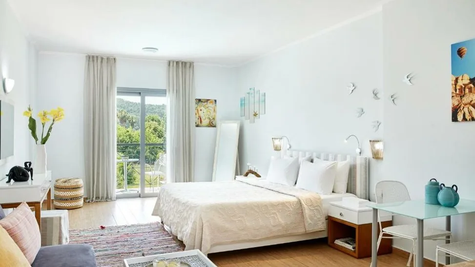 Hotel Sappho je moderan objekat sa 4 zvezdice, smešten u mirnom delu Parge, u zelenilu regiona Epir u Grčkoj. Nalazi se u blizini čuvene plaže Valtos, na svega oko 350 m od plaže, do koje se stiže prijatnom šetnjom. Istovremeno, živo šetalište i stari grad Parge sa tavernama, barovima i prodavnicama udaljeni su približno 2 km, pa gosti mogu lako da kombinuju miran odmor sa večernjim izlascima u centru. Transfer od aerodroma Preveza obično traje oko sat vremena, što hotel čini praktičnim izborom za kraće i duže boravke. ([apollo.se](https://www.apollo.se/grekland/parga/hotell/sappho/faciliteter?utm_source=openai))