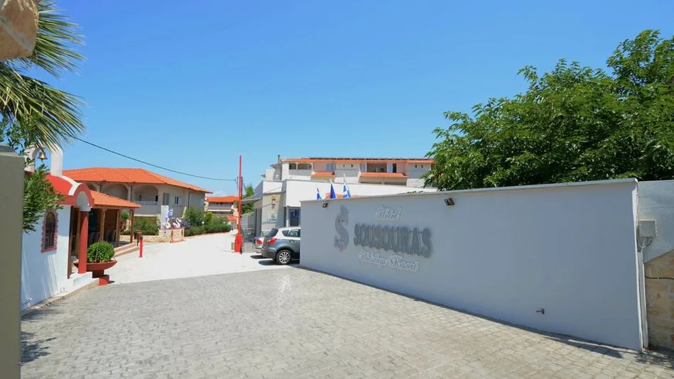 Hotel Sousouras je prijatan porodični kompleks sa 3 zvezdice, smešten direktno na peščanoj plaži Haniotija, na poluostrvu Kasandra, na Halkidikiju, u Grčkoj. Nalazi se u prostranom zelenom vrtu od oko 20 ari, sa palmama i mediteranskim rastinjem, što stvara osećaj prave letnje oaze. U neposrednoj je blizini centra Haniotija, do kog se stiže laganom šetnjom, gde gosti mogu pronaći prodavnice, taverne i barove. Plaža ispred hotela je uređena, sa ležaljkama i suncobranima, a blizina glavnog puta omogućava dobru povezanost sa ostalim mestima na Halkidikiju.