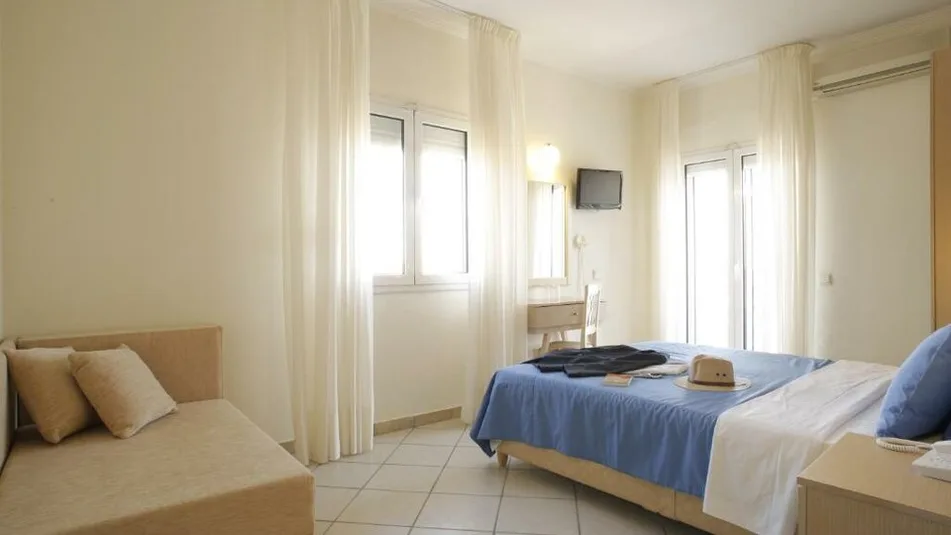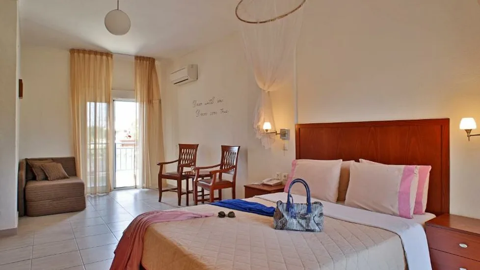 Smeštaj u hotelu Stratos organizovan je u udobnim sobama i apartmanima različitih tipova, prilagođenim parovima, porodicama i manjim grupama prijatelja. Gostima su na raspolaganju standardne dvokrevetne i trokrevetne sobe, kao i prostranije porodične jedinice i apartmani. Posebno se izdvajaju porodični apartmani sa dve međusobno povezane sobe, koji pružaju komfor i privatnost, pa su idealni za smeštaj do 4 osobe. Sve smeštajne jedinice opremljene su klimom, frižiderom, televizorom, sefom, fenom za kosu, mrežicama protiv komaraca i bežičnim internetom, što obezbeđuje udoban boravak tokom celog odmora. ([stratoshotel.gr](https://www.stratoshotel.gr/accommodation/family-suites/?utm_source=openai))