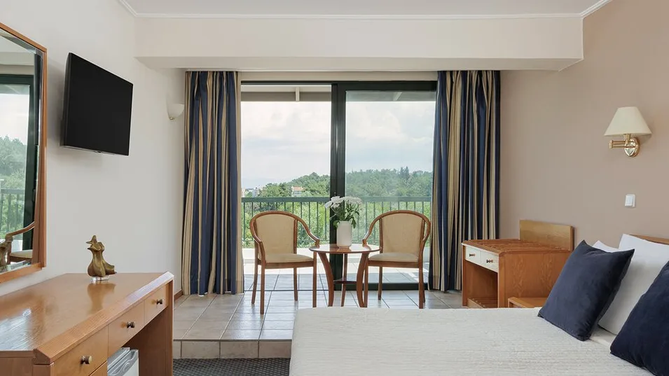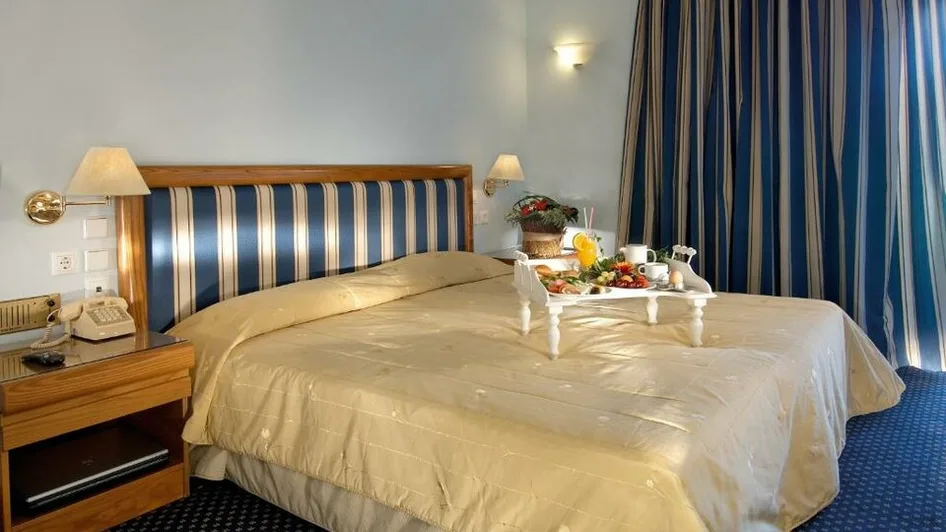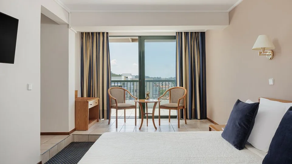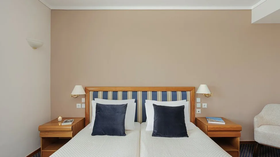 Hotel raspolaže moderno uređenim sobama različitih kategorija, od standardnih dvokrevetnih do prostranijih apartmana, ukupno oko 120 soba. Sve smeštajne jedinice imaju balkon ili terasu, kupatilo sa kadom ili tuš kabinom, klima-uređaj, televizor, telefon i mini frižider, a u pojedinim sobama moguć je i pomoćni ležaj za treću osobu ili dete. Gosti mogu da biraju sobe sa pogledom na baštu ili grad, kao i smeštaj sa bočnim pogledom na more, dok su apartmani idealni za parove koji žele više komfora ili manje porodice. ([travelland.rs](https://www.travelland.rs/smestaj/grcka/agia-triada/hotel-sun-beach-agia-triada/103314/?utm_source=openai))