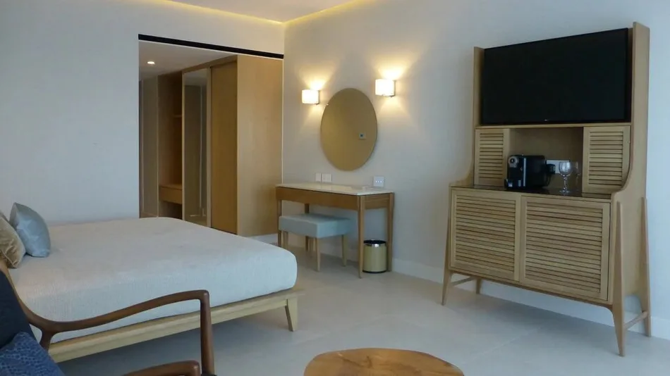 Smeštajne jedinice su moderno uređene, sa naglaskom na komfor i diskretan luksuz. Hotel raspolaže savremenim dvokrevetnim sobama sa pogledom na kopno ili more, kao i sobama sa direktnim izlazom na bazen za dodatnu dozu ekskluzivnosti. Sve sobe su klimatizovane, imaju balkon ili terasu, moderno kupatilo sa tušem u ravni poda, aparat za espreso, televizor i besplatan internet. Kapacitet većine soba je namenjen za 2 odrasle osobe, što obezbeđuje intimnu i mirnu atmosferu bez gužve. Ukupan broj smeštajnih jedinica je oko 150 soba, raspoređenih u nekoliko spratova, sa liftom.