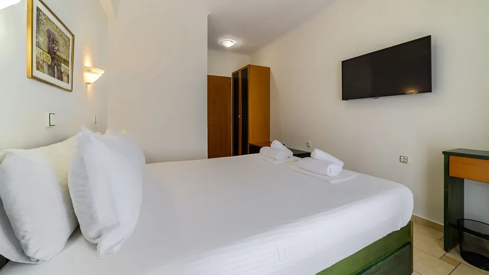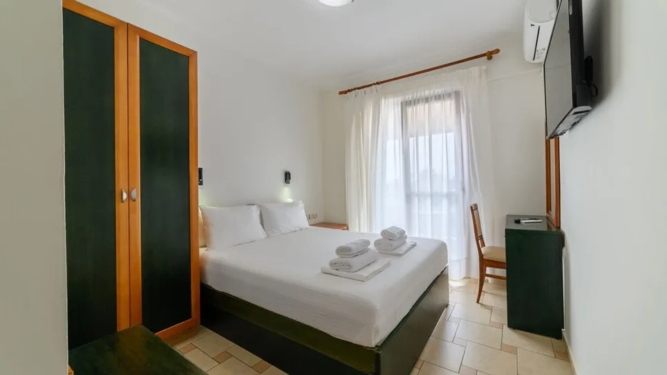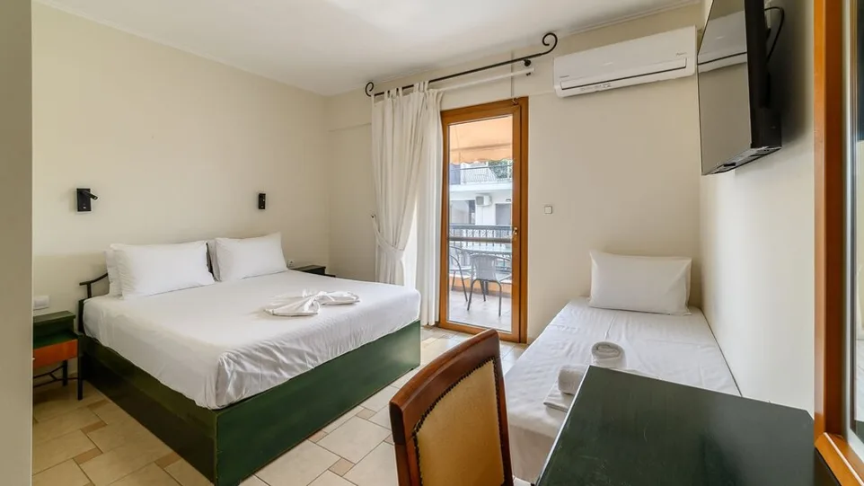 Syrtaki Beach je manji, porodični hotel kategorije 3 zvezda, sa ukupno 22 sobe, što garantuje intimniju i mirniju atmosferu u odnosu na velike komercijalne komplekse. U ponudi su jednokrevetne, dvokrevetne i trokrevetne sobe, opremljene klimom, televizorom, frižiderom, sopstvenim kupatilom sa tušem i terasom ili francuskim balkonom. Sve sobe imaju pristup bežičnom internetu, a redovno čišćenje, zamena peškira i posteljine obezbeđuju dodatnu udobnost tokom boravka. ([filoxeno.com](https://www.filoxeno.com/minipage/index/es/accommodation/filoxeno/59627/syrtaki?utm_source=openai))
