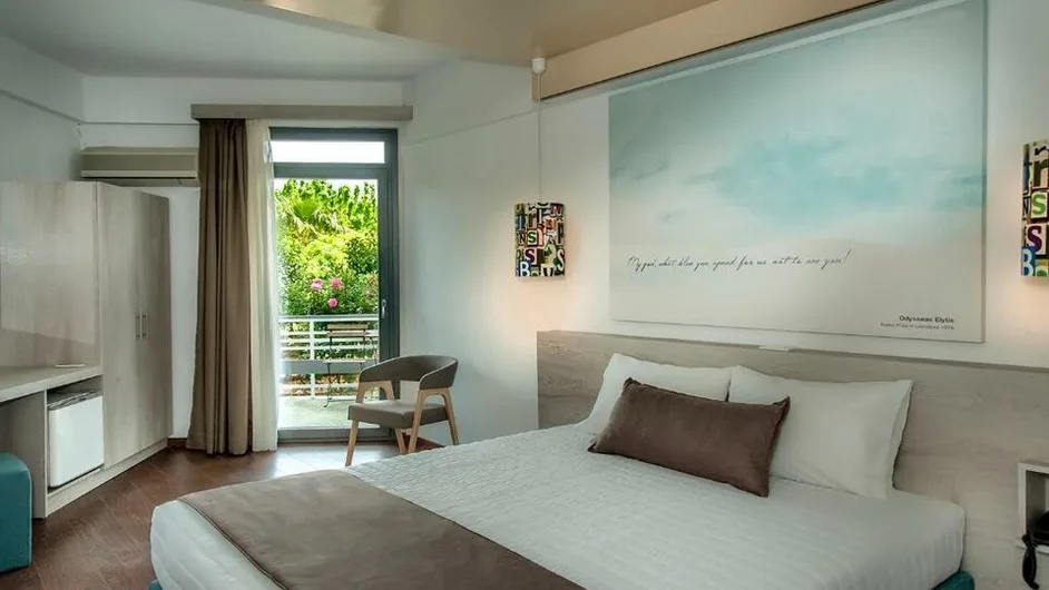 Hotel raspolaže sa oko 140 soba, smeštenih u glavnoj zgradi i bočnim krilima, većinom sa pogledom na more ili mirne baštenske aleje. Standardne dvokrevetne sobe prijatno su uređene u mediteranskom stilu, sa mogućnošću dodatnog ležaja za dete ili treću osobu. Porodične sobe nude praktičniji raspored i više prostora za roditelje sa decom, dok su dostupne i komfornije sobe za goste koji žele udobniji boravak. Sve smeštajne jedinice imaju klima-uređaj, televizor, bežični internet, mini frižider i balkon ili terasu, što obezbeđuje prijatan odmor nakon dana provedenog na suncu.