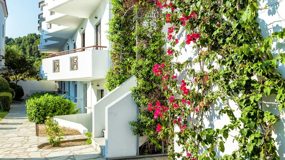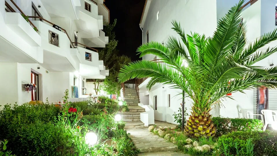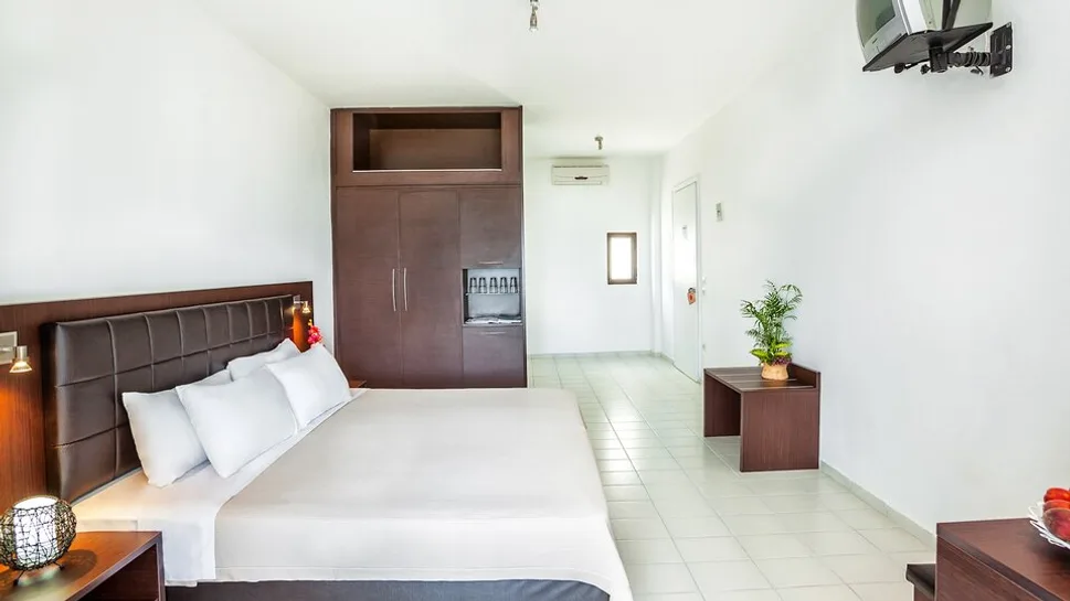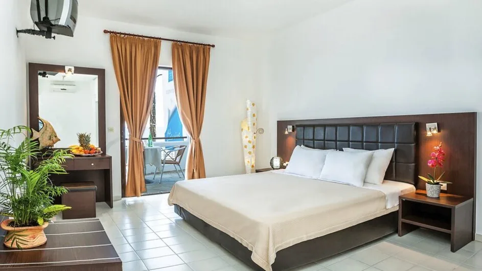 Smeštaj je organizovan u nekoliko nižih zgrada oko dvorišta i bazena, sa dvokrevetnim, trokrevetnim i porodičnim sobama. Standardne sobe su namenjene parovima ili manjim porodicama, dok prostranije porodične sobe mogu ugostiti više osoba, idealne su za roditelje sa decom. Sve sobe imaju kupatilo, klima-uređaj, televizor, telefon, mali frižider i balkon ili terasu, od kojih deo nudi bočni ili direktan pogled na more. Funkcionalan raspored i jednostavan, ali prijatan enterijer obezbeđuju udoban boravak tokom letovanja.