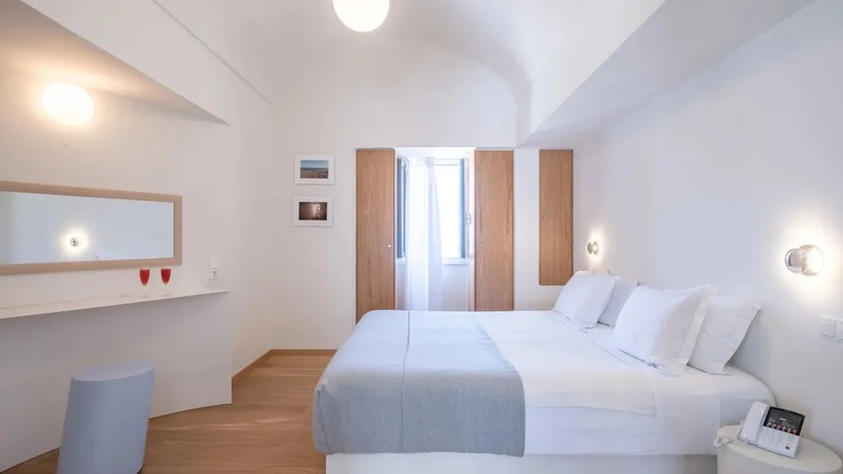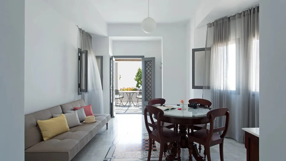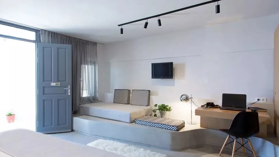 Hotel raspolaže manjim brojem ekskluzivnih smeštajnih jedinica – studija i apartmana, od kojih mnogi imaju privatne terase sa pogledom na more, a pojedini i hidromasažnu kadu na otvorenom. U zavisnosti od tipa, sobe mogu ugostiti od romantičnog boravka za dvoje do porodica ili malih grupa od četiri osobe. Prostrani dnevni boravci, odvojene spavaće sobe i elegantno uređeni enterijeri u tradicionalnom kikladskom stilu, dopunjeni modernim detaljima, stvaraju osećaj privatne letnje rezidencije, a ne klasične hotelske sobe. Za udobniji boravak, hotel nudi i porodične smeštajne jedinice sa više prostora.