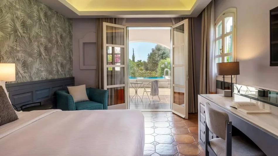 Smeštaj u Zeus Eretria Resortu organizovan je u modernim sobama i bungalovima, sa pogledom na uređene vrtove ili more. Standardne dvokrevetne sobe sa pogledom na baštu pogodne su za parove i manje porodice, dok prostrane porodične sobe i apartmani u bungalovima nude dodatnu udobnost za veći broj gostiju, sa kapacitetom do 5–6 osoba. ([zeusintl.com](https://www.zeusintl.com/zeus-eretria-resort/accommodation?utm_source=openai)) Porodični bungalov apartmani sa pogledom na more, kao i varijante sa privatnim bazenom, pružaju osećaj intimnosti i izdvojenosti, idealan za duži boravak. Sve jedinice su klimatizovane, moderno uređene, sa savremenim sadržajima koji obezbeđuju komforan boravak za goste svih uzrasta. ([zeusintl.com](https://www.zeusintl.com/zeus-eretria-resort?utm_source=openai))
